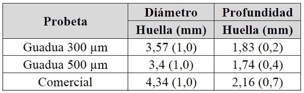 Fuente: elaboración propia.La resistencia a la penetración de compuestos de partículas de Guadua 500 µm y 300 µm y compuesto comercial se muestran en la Tabla 2. Se observa que los compuestos de Guadua tienen mayor resistencia a la penetración frente a los compuestos comerciales. La huella marcada en diámetro y profundidad en compuestos de Guadua 500 µm y 300 µm (Tabla 2.), representa el comportamiento que ha presentado este compuesto en pruebas mecánicas. Es decir, el compuesto Guadua 500 µm se muestra más resistente que su símil Guadua 300 µm. Sin embargo, el compuesto comercial permite una penetración significativamente mayor que la observada en compuestos de Guadua. Lo que puede entenderse como se explicó líneas atrás, que la fibra de bambú es más porosa que la de la madera permitiendo mayor penetración de la resina y por consiguiente mayor adherencia [40].