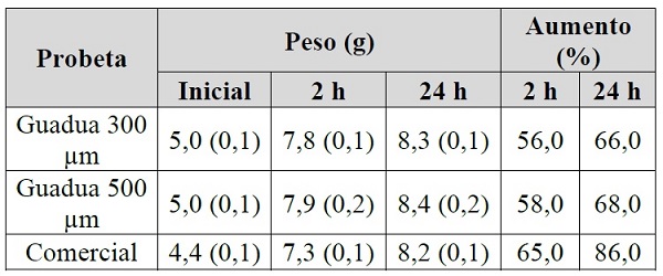 El porcentaje de absorción de agua en compuestos de Guadua 500 µm y 300 µm durante 2 h (58 % y 56 %) y 24 h (68 % y 66 %), fue menor que el obtenido en compuestos comerciales. El compuesto comercial evidenció el 21% de mayor absorción de agua frente al compuesto guadua 500 µm y 23 % de mayor absorción de agua frente al compuesto guadua 300 µm. Lo que podría explicarse en que las partículas de guadua lograron mayor contacto por adherencia y esto produjo menor volumen de espacios vacíos entre las partículas, por lo cual la penetración del agua pudo ser obstruida (Figura 3).