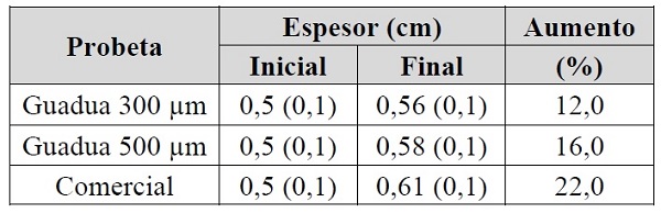 La Tabla 3, muestra los resultados obtenidos en pruebas de absorción de agua e incremento de espesor por hinchazón en compuestos de Guadua (partículas 500 µm y 300 µm) y compuestos comerciales.