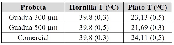 Fuente: elaboración propia.Los resultados obtenidos muestran que el lado posterior de los compuestos de guadua mantuvo menor temperatura frente al compuesto comercial, esto es un indicativo del paso de calor permitido por el compuesto debido a la temperatura de la hornilla. En este contexto, el compuesto guadua 500 µm mantuvo hasta un 10% de menor paso de calor frente al compuesto comercial. El compuesto guadua 300 µm por su parte, mantuvo hasta un 4% de menor paso de calor frente al compuesto comercial. Este comportamiento también soporta la tesis de la calidad de adhesión conseguida en la fabricación de los compuestos de partículas de guadua, en donde la aglomeración pudo generar menor índice de porosidades lo que permite mayor aislación térmica.