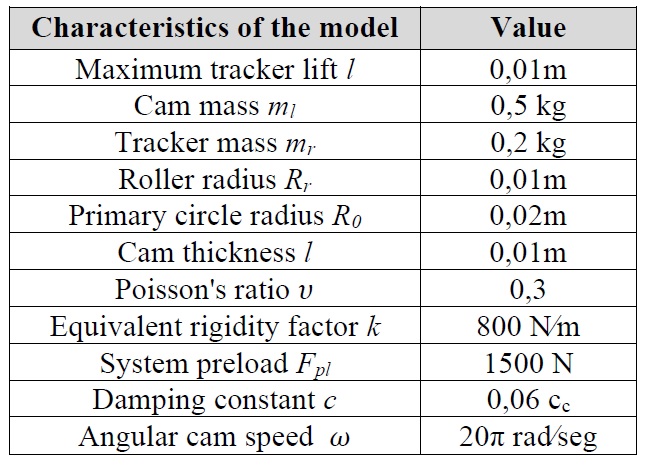 From figure 2 it can be seen that the starting point in the process to determine the effective stress in a system cam- follower, is to establish the law of displaceent, which represents the position of the tracker during a complete tyrn of cam, in the case of disc cams with translation tracker, this paremeter is directly related to the final shape of the cam [8].
