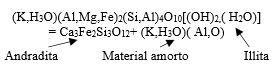 De acuerdo con los diagramas de DRX 4, durante el proceso alcalino llevado a cabo se formó Andradite (Ca3Fe2Si3O12). Este compuesto ha sido reportado en pastas de tipo geopolimérico, y de acuerdo los procesos de carbonatación de estos compuestos en materiales cerámicos del tipo cementante, se podría inferir que algún carbonato reacciono con la illita, para la formación de andradita, explicado a en la ecuación 9: