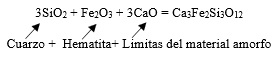 (10)La formación de andradita es importante en el proceso de geopolimerización, se busca su formación para obtener compuestos de mayor resistencia a partir de la andradita como la Wollastonita CaSiO3 [24], dada la cantidad de reacciones que se dan simultáneamente en el proceso de formación podría también darse las siguiente reacciones para la formación de andradita desde el material amorfo (ver ecuación 11).