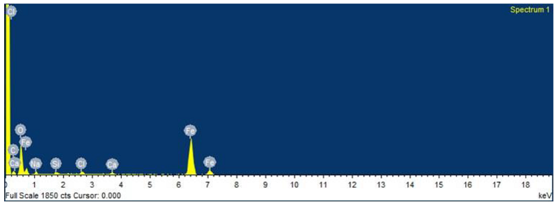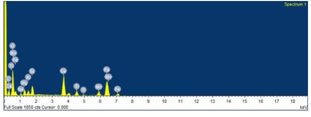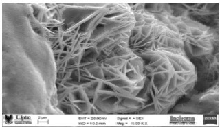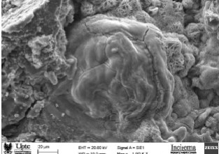 La morfología encontrada en la muestra del geopolímero de la figura 8, es característica de los carbonatos de calcio presentes en las estructuras cristalinas del cemento portland. Esta se caracteriza por aguzas desordenadas, su formación se atribuye a la reacción del CO2 de la atmosfera, reacciona con los silicatos y aluminatos de calcio de la fase amorfa, su composición química se muestra en el EDX de la figura 9.