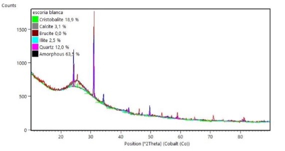 En el diagrama de DRX mostrados en la figura 2, se muestra la escoria blanca sin tratamiento. De acuerdo a esta figura el material amorfo de la escoria presente es de 62.5%, 2.5% de illita y 3.1% de calcita. De acuerdo a la teoría, el material amorfo debe reaccionar en el medio altamente alcalino, para la formación de microestructuras del tipo geopolimérico.