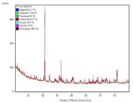 La escoria blanca enfriada del horno convertidor fue seleccionada aleatoriamente y se trasladó al laboratorio donde se caracterizó por difracción de rayos x y fluorescencia de rayos x, según se muestra en (ver figura 2) y (ver Tabla 1).