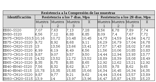 Los resultados de los ensayos de resistencia a compresión, fc, para las mezclas ternarias a edades de 7 días y 28 días se muestran en la Tabla 3.