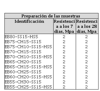 Se prepararon 3 mezclas de escoria Blanca con adiciones parciales de Silicato de Sodio y RC, se usaron 3 mezclas de réplica, de forma independiente. Las proporciones con relaciones en peso de las mezclas se resumen en la Tabla 2. Las abreviaciones EB, CH, HS y SS se utilizaron para identificar a los materiales escoria blanca, escoria Negra, Hidróxido de Sodio y Silicato de Sodio, respectivamente por sus siglas. EB8-CH1-SS1 representa la mezcla de 80% escoria blanca, 10% RC y 10% Silicato de Sodio, EB8-HS0,5- SS15 representa la mezcla de 40% escoria Blanca, 5% Hodróxido de Sodio y 20% Silicato de Sodio.