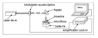 En la figura 10 se muestra un arreglo experimental típico, conocido como configuración en transmisión de calor o resuelta en frecuencia, que mide la amplitud de la señal fotoacústica, S, generada en una celda abierta. Este arreglo permite medir de forma directa la difusividad térmica, αs, de una muestra sólida en forma de lámina con un espesor definido, así como también su coeficiente de expansión térmico lineal, 𝛼𝑇. Sobre la celda, la muestra sella herméticamente la cámara de aire del micrófono condensador o de electret. La cara contraria de la muestra se expone a un haz de luz láser (454 nm), modulado en intensidad periódicamente. El calentamiento que se genera en la superficie de la muestra se difunde a través de ésta mediante conducción. Esto genera cambios periódicos de temperatura y por lo tanto de presión, dentro de la cámara de la celda fotoacústica, que son captados por la membrana del micrófono. El amplificador Lock-in extrae la señal de interés y mediante protocolos de comunicación envía a un computador los datos, que luego son tratados con algoritmos de ajuste multiparamétrico.