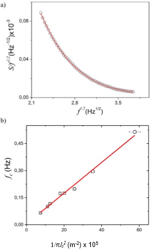 Inicialmente se obtuvo el valor de la frecuencia de corte, fc, aquella para la cual la longitud de difusión térmica es igual al espesor de la muestra, del mejor ajuste de los datos experimentales de la amplitud S divida entre la raíz cuadrada de la frecuencia de modulación del haz de luz incidente, f, en función de la raíz cuadrada de f, considerando la ecuación 18 de la referencia 29, como se registra en la figura 11 a). Mientras que del ajuste de la curva de la figura 11 b), de fc en función de 1/π l 2, se halló la difusividad térmica, αs, teniendo en cuenta que fc=ɑs/πƖ2 y se obtuvo un valor de (8.5±0.4)x10-8m2s-1. De acuerdo con el procedimiento propuesto por Bedoya et al, se graficó el valor de ɑ1, calculado con la ecuación 19 en la referencia[29], en función de la frecuencia de corte de un conjunto de muestras de adhesivo de diferentes espesores, Los resultados son presentados en la figura 12.