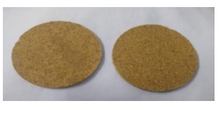 Con el fin de probar el pegante en la elaboración de aglomerados, se mezcló aserrín de guadua de tamaño de partícula 500 µm con el adhesivo de aceite de higuerilla en una relación 1:1, mediante agitación mecánica, aproximadamente por 10 minutos. Este producto se depositó en un recipiente cilíndrico y fue prensado con 50 kg-f hasta alcanzar una temperatura de 160 °C, durante 10 minutos y se dejó enfriar a temperatura ambiente; posteriormente, fue separado y secado por 24 horas. El aglomerado en forma de disco, como se muestra en la figura 13, tuvo un diámetro de 11 cm y espesor 0.72 mm, aproximadamente