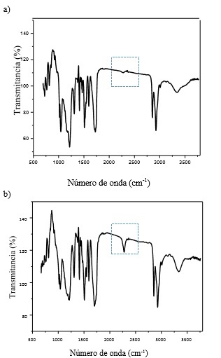 Como se puede ver en las figuras 3 a) y 3 b), entre 2100 y 2250 cm-1, no se observa la banda correspondiente al grupo del isocianato en el espectro del producto obtenido con la relación de equilibrio. Lo que indica una reacción completa para la formación del poliuretano; es decir, después de la síntesis no quedan moléculas libres de este compuesto. La banda entre 3300 y 3500 cm-1 corresponde al estiramiento de los grupos N-H, mientras que los picos entre 1640 y 1730 cm-1 se asocian a modos de vibración del grupo carbonilo, presente en los uretanos. Por otro lado, la banda pronunciada entre 2800 y 3000 cm-1 hace referencia a los estiramientos de enlace de los grupos C-H y los que aparecen entre 1480 y 1640 cm-1, a la interacción C-N.