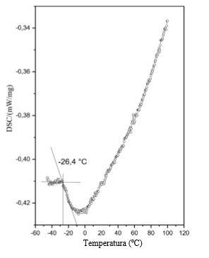 En el termograma de la figura 4 se observa una caída de la curva en -26.4 ºC, que indica el cambio del flujo de calor, relacionado con un aumento en la capacidad calorífica. Esta temperatura de transición vítrea (Tg) es el valor por encima del cual no se quiebra la muestra. Este dato es el mismo del policloruro de vinilildeno y aunque para algunos materiales como polietileno PEAD y PEBD este valor está en un rango más amplio, entre -35 y -120°C [22], la Tg hallada es suficiente para que el pegante conserve sus características en un rango amplio de condiciones climáticas.
