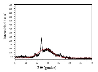Se utilizó la difracción de rayos X para determinar la estructura del producto y obtener información sobre la cristalinidad del poliuretano. En el difractograma de la figura 5 se observa un pico en 2ϴ = 17º, relacionado con la cristalización de las partes blandas del elastómero.