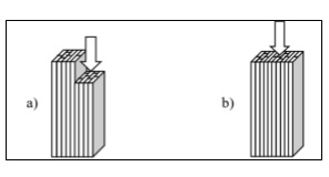 De acuerdo con la misma norma, se hicieron las pruebas de compresión paralela a la fibra y se obtuvo una resistencia de las probetas de 43±3 MPa, con un coeficiente de variación de 6.83 %. En este caso, el 90 % de las muestras sufrieron falla de fisura horizontal. Este esfuerzo que soporta el material puede llegar a ser hasta10 veces mayor que el correspondiente a ensayos perpendiculares a la fibra, lo que indica alta resistencia a la deformación estructural [16]. El valor medido es 30 % más bajo que el reportado por Correal et al [25] para laminados de este mismo tipo de guadua adheridos con una mezcla de urea-formaldehído (50 %) y melanina- formaldehído (50 %), de 62 MPa, con un coeficiente de variación de 3.1 %.