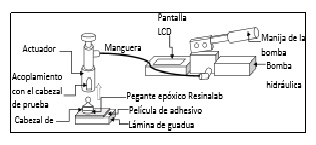 Las pruebas de adherencia del pegante sobre latas de guadua se hicieron a través de un proceso como el que se muestra en la figura 7, en el que se esparció el adhesivo sobre la superficie de la probeta y se dejó secar; posteriormente, sobre la capa seca de adhesivo se pegó el cabezal de prueba, llamado “Dolly” de 20 mm de diámetro, por prensado durante un tiempo de 48 horas con un pegante époxico flexible (Resinalab EP11HT Gray) que tiene una fuerza de tensión que supera el límite máximo de rendimiento del sistema de presión en condiciones ideales. Finalmente, con un equipo Positest AT-M, de 0 a 0.345 MPa/s se aplicó presión y se obtuvo falla cohesiva (desprendimiento de sustrato) cuando la presión llegó, en promedio, a 1.0±0.2 MPa; mientras que con un pegante convencional para madera (marca carpincol) se obtuvo un valor de 0.9±0.2 MPa.
