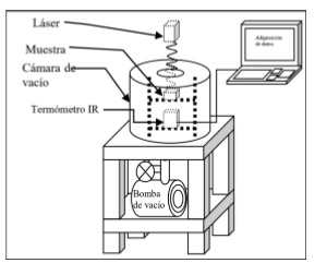 En la figura 8 se muestra un esquema del sistema experimental de relajación térmica (RT) que se usó para medir el calor específico del adhesivo. La muestra se radia con un haz de luz láser (en este caso de longitud de onda de 480 nm) y se registran las variaciones de temperatura, utilizando termometría IR; esta medición se repite dentro de una cámara cilíndrica de acero inoxidable de 400 mm de alto y 250 mm de diámetro, en la que se hace vacío mediante una bomba Leybold Trivac D 2,5 E, con la que se alcanza una presión interna de alrededor de 2x10-3 mbar. En su configuración convencional, esta técnica se basa en la perturbación, mediante iluminación constante, del estado de equilibrio termodinámico de una muestra suspendida adiabáticamente dentro de una celda en la que se hace vacío, y en la medición de la variación de su temperatura absoluta T en función del tiempo (t). Si la desviación de la temperatura del sistema con respecto al estado de equilibrio es pequeña (ΔT<0), la relajación se manifiesta de acuerdo con la ecuación (1):