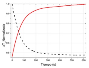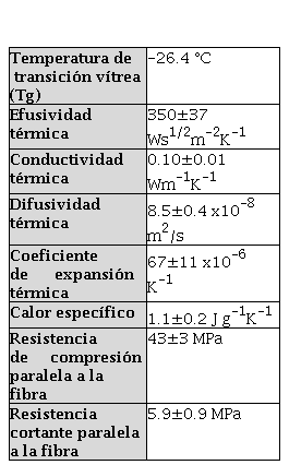 Se midió el calor específico y la capacidad calorífica por unidad de volumen de una muestra del aglomerado de densidad 0.65 g/cm3, empleando el método de relajación térmica se obtuvo un valor de Cp=0.83±0.06 J cm-3K-1 y usando la densidad se calculó c=1.26±0.03 J g-1K-1. Este valor de c es similar al reportado para tableros de fibra de densidad media (MDF, sigla en inglés para medium- density fibreboard), entre 1.1 y 1.2 J g-1K-1 para temperaturas entre 40 y 60 °C [32], y es más alto que el de la fibra de guadua, que está entre 1 y 1.2 J g-1K-1 para densidades que van de 1,2 a 1,5g/cm3 y que el de la fibra de vidrio que está entre 0.796 y 0.81 J g-1K-1 para densidades entre 2,35-2,5 g/cm3 [33].