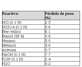 En la tabla 2 se encuentra el promedio de la pérdida de peso de las muestras del adhesivo sólido, en la prueba de resistencia a algunos reactivos químicos. Se observaron cambios leves del peso del pegante, que conserva su apariencia para la mayoría de los productos utilizados; en particular la reacción al agua, con la que puede haber mayor contacto en aplicaciones prácticas, dio lugar a un desgaste de apenas 0.2 %. Se observó abultamiento con el ácido sulfúrico y acetona y deformación únicamente con éter-etílico.