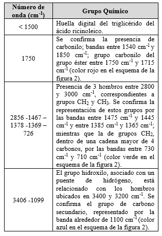 De acuerdo con la norma NTC 218:2011 se determinó el índice de acidez del aceite, con un valor de 2.17 mg KOH/ g (muestra); mientras que el índice de hidroxilo, de 179.3, se obtuvo siguiendo la norma NTC 1529:1998, vigente para “aceite puro de castor (aceite de ricino) para la industria de cosméticos”, a través de una mezcla de anhídrido acético y piridina.