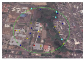 Inicialmente, para considerar las mediciones del equipo como impactos directos, estas se debían encontrar dentro de un radio aproximado de 200 metros, demarcado por el círculo verde, asumiendo como centro la ubicación del equipo, teniendo en cuenta que esta distancia corresponde al error de localización medio proporcionado por la red LINET.
