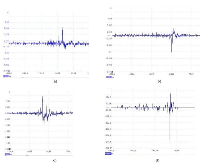 En la Tabla 4 se observan las coordenadas, altura respecto al nivel del mar, la distancia entre la sede UIS Barrancabermeja y el punto de localización en el suelo (distancia horizontal) y hora local de las fuentes registradas por el LMA dentro del área. Se observa que existen fuentes que, a pesar de estar próximas en distancia horizontal al punto de incidencia, presentan alturas que superan los cuatro kilómetros de longitud, por lo cual, se concluye que las mediciones adquiridas por el equipo de medida de corriente de rayo no corresponden a señales de impactos directos, pues considerando que Barrancabermeja se encuentra a 75,94 msnm y sumando la altura de la terraza se estima que la altura para este tipo de impacto estaría a 90 metros, aproximadamente. Además, las formas de onda registradas por el equipo de medición mostradas en la Figura 10 a, b, c, d, con tiempos de frente de 1,7 μs, 2,7 μs, 1,4 μs y 0,6 μs respectivamente, que están en el rango entre 0,5 μs a 5 μs, corresponden más a señales inducidas.