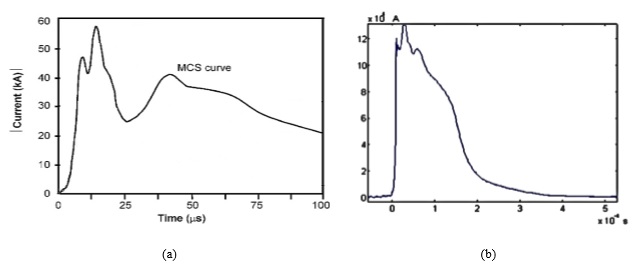Se observa también que la tendencia de la forma de las señales difiere de la presentada en las formas de onda de corriente de retorno debidas a impactos directos nube- tierra encontradas en el estudio realizado en la estación Morro do Cachimbo en Brasil (Figura 11a) y en el ámbito nacional, en el estudio realizado por Horacio Torres en la estación experimental Ilyapa en Samaná - Caldas (Figura 11b)
