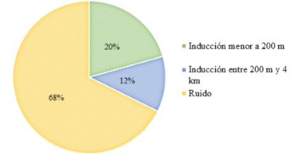 Del total de los registros obtenidos durante el periodo de medición, como se muestra en la Figura 13, se puede decir que alrededor del 20% de las señales corresponden a corrientes de rayo inducidas en un radio inferior a 200 m, un 12% a señales de corriente inducidas originadas por eventos atmosfericos en una región definida entre un radio mayor a los 200 m y un radio menor a 4 km, mientras que el 68% restante se debe a ruidos o interferencias captadas por el equipo de medición. Dentro de las señales clasificadas como ruido se encuentran aquellas que tuvieron relación con transitorios resultados de la energización del equipo, desconexión del osciloscopio (descritas dentro de la hoja de datos del fabricante) e interferencia de aires acondicionados cercanos al equipo. Todas estas señales lograron ser excluidas del análisis al tener en cuenta que sus formas de onda no correspondían con inducciones de rayos.