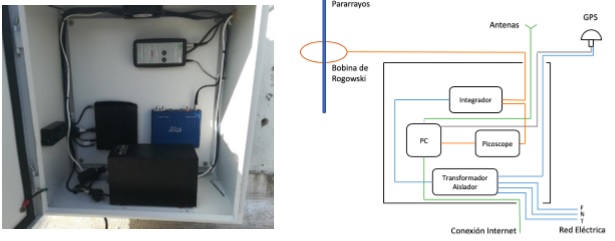 En la Figura 2 se presenta la vista final de la distribución de los elementos del equipo al interior de la caja y un esquema de cómo se encuentran interconectados. El sensor de corriente utilizado fue una bobina de Rogowski con un integrador de la empresa PEM con la capacidad de medir corrientes de hasta 120 kA con un 𝑑𝑖/𝑑𝑡 máximo de 120 𝑘𝐴/𝜇𝑠. La señal medida se digitaliza a través de un osciloscopio Picotech 3205D con un ancho banda de 100 MHz, una resolución de 8 bits y una tasa de muestreo de 1 GS/s. La señal digitalizada se transfiere a un computador FitPC4 de dimensiones reducidas y bajo consumo (24 W), donde se almacena y se sincroniza en tiempo mediante un GPS GARMIN 19x ubicado en el exterior del equipo. Para realizar la comparación entre los registros de tiempo del equipo y la red LINET, el computador leía los datos provenientes del GPS y realizaba la sincronización del computador con una precisión de 1 s. No se contó con circuitos adicionales para realizar la sincronización. Adicionalmente, el computador mediante WiFi o la red LAN permite el acceso remoto a las señales medidas. Los dispositivos se alimentan de la red eléctrica a través de un transformador de aislamiento de 350 VA, el cual evita que se propaguen interferencias externas hacia el equipo. Los dispositivos fueron ubicados dentro de un cofre de intemperie hermético, fabricado en aluminio, que permite apantallar los equipos contra el campo electromagnético producido por el rayo.