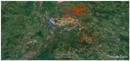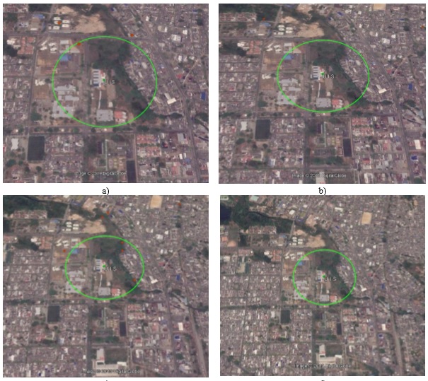 A partir de este criterio se trazó una circunferencia de dicho radio en Google Earth (Figura 4) observando que en los días 27 de noviembre (Figura 4b) y 22 de noviembre (Figura 4d) de 2018, no se encuentran impactos dentro del círculo, pues el impacto más cercano ocurrió a 460 m y 1500 m respectivamente, sin embargo, para los dos días restantes (Figura 4a y 4c) si se encuentran impactos dentro del radio demarcado.