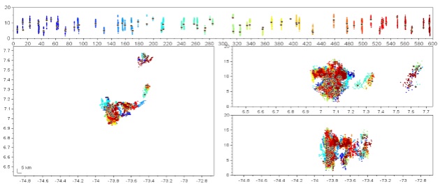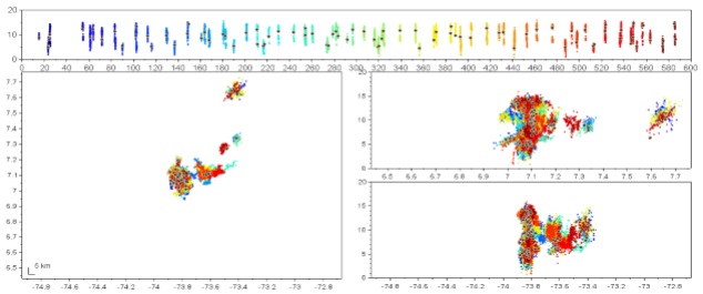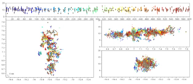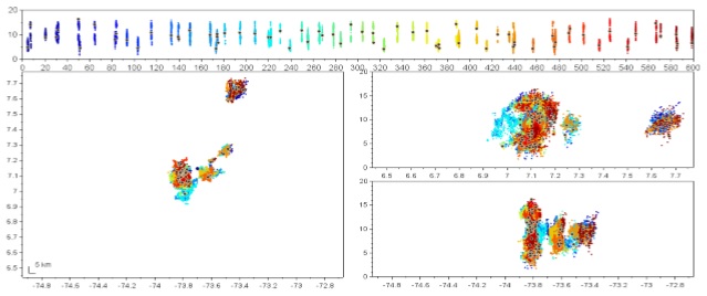 Se analizó información del LMA correspondiente al 20 de febrero de 2019 entre las 5:10 - 5:20, hora local, o entre 10:10 - 10:20, UTC, y 23 de noviembre de 2018 entre las 2:00 - 2:30, hora local, o entre 7:00 - 7:30, UTC. Los datos registrados pueden ser visualizados en intervalos de tiempo de 10 minutos, por lo cual, se tuvieron en cuenta cuatro intervalos, los datos correspondientes a estos periodos se muestran en la Figura 5, 6, 7y 8 respectivamente. Cada panel muestra la evolución temporal (color de los puntos) y espacial. El panel superior muestra la altitud de las fuentes de rayos en función del tiempo (segundos), el panel inferior izquierdo muestra la evolución de la tormenta espacialmente (latitud versus longitud), los paneles inferiores derechos muestran la altura vs latitud y altura vs longitud respectivamente. Se puede ver que para el 20 de febrero gran parte de la tormenta se desarrolla a alturas superiores a los 3 km, descartándose la presencia de rayos nube-tierra. En el caso del 23 de noviembre se evidencian líderes en general con alturas por encima de los 2 km, excepto en el caso de las 7:10 a 7:20 (Figura 7) en el que algunas fuentes se registran a alturas de 1 km, existiendo alta probabilidad de impactos nube a tierra.