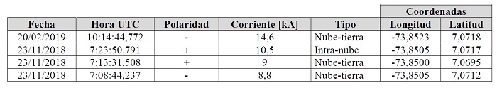 En la Tabla 1 se muestra la información de los cuatro impactos obtenidos por la red de localización de rayos que se sitúan en las proximidades de la sede UIS Barrancabermeja, tres de ellos presentados el día 23 de noviembre de 2018 y uno el 20 de febrero de 2019, de igual manera, en Tabla 2, se presenta la información extraída de las mediciones adquiridas mediante el equipo de medición de corriente de rayo durante el lapso mencionado anteriormente.