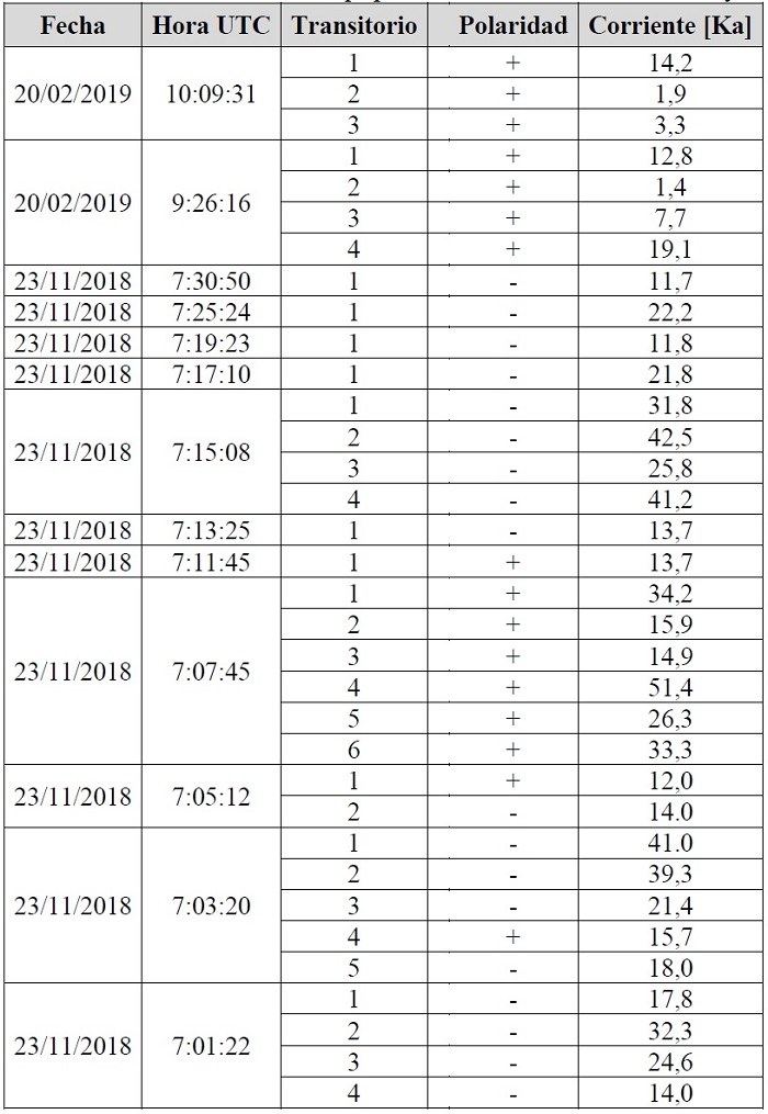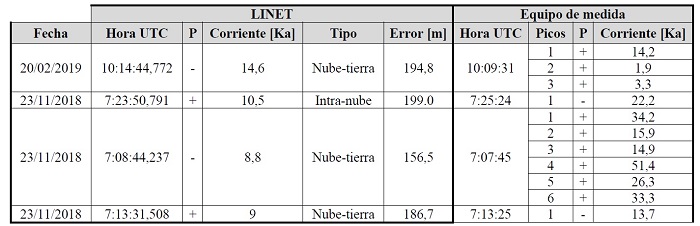 Durante el periodo de adquisición, el equipo registró 68 mediciones debidas a posibles rayos ocurridos durante este tiempo, de las cuales, se conocen características como la forma de onda, valor pico de corriente, polaridad, fecha y hora UTC en que han tenido lugar o han sido detectadas. Conocida la fecha y hora específica de cada medición, comprendida entre las 0 y 24 horas y teniendo presente que la hora UTC corresponde a 5 horas más que la hora local, se procede a comparar con la información proporcionada por LINET. Para tal fin, se recurre al registro histórico que es la opción que más información brinda, de manera que, al realizar inspección se encuentren registros de eventos de descargas atmosféricas relacionadas en espacio y tiempo.