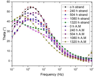 Figures 8 and 9 show the Bode diagram for the impedance module and the phase angle respectively. The impedance module displays a constant region at high frequencies, this is maintained for the strand and the AM steel, and at low frequencies the sum of the solution resistance and polarization resistance is obtained. However, the impedance experiences a considerable reduction after 1320 h of evaluation, this is due to the degradation of the material with the time of exposure, that is to say, the resistance to polarization decreases. From the phase angle diagram, Figure 9, the strand evidence the formation of only one time constant until 504 hours of evaluation, however, for 1080 and 1320 hours of immersion it is observed the appearance of 2- time constants one located at medium frequencies and another at low frequencies, aspect linked to the appearance of oxides on the surface, depending on the electrochemical behavior seen in the curves, the literature reports that the formation of oxides on the surface occurs as the appearance of a porous and poorly adherent layer, which does not limit the corrosion process to continue. [38, 39, 40, 41, 44]. The AM steel, shows the appearance of a single time constant located at medium frequencies for the first hours of evaluation, for 1320 h, a shift towards low frequencies is detailed [13,38,42]. Overall, these results indicate the degradation of the material (AM), due to the electrochemical phenomena that occur in the reaction of the electrolyte and the immersed material, a phenomenon given by the lack of corrosion products that promote a barrier effect on the surface of the material [37,38,43], however, AM steel shows greater resistance to corrosion than the strand.