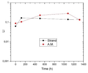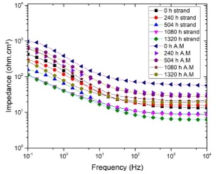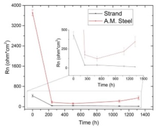 The results of the calculation of the noise resistance (Rn) are shown in Figure 11. This parameter is directly related to the corrosion resistance of the materials, this tool has allowed to see that AM steel has a greater resistance to corrosion that the strand, however, again details the degradation of the material, product of the electrochemical phenomena that appear in the system [20,25-2628]. For 0 hours of immersion both materials show the highest noise resistance value, for the strand, it begins to decline until the end of the test, in the case of AM steel, the noise resistance value drops until 504 h and later evidence a slight increase, this is in accordance with the results presented in EIS.