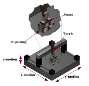 The steel manufactured by AM was obtained from a MIG-Router CNC machine at the Facultad de Ingeniería- Universidad Nacional Autónoma de México. For this purpose, a solid filament is used, designated AWS ER70S-6, which is kept at a distance between the torch and the surface of 8 mm, in addition to the following parameters: a current of 80 A, a voltage of 35 V with an argon flow of 0.4247 m3/h, an electrode advance speed of 15 m/min; This process is done by superimposing 5 layers of material leaving a solidification time of 60 s between every 2 layers, these variables are considered optimal, to generate material with an adequate combination of mechanical properties, according to studies carried out by Cervantes et al. [2]. Figure 1 shows an outline of the process.
