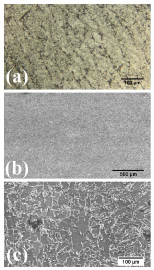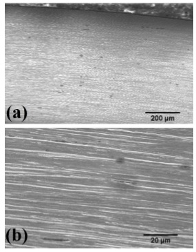 Figure 2a shows the cross-section of the strand, here the high degree of plastic deformation in its microstructure is evident, which is the product of the wire drawing process applied to obtain this material. In figure 2b, a zoom is observed. This allows to identify in more detail the orientation of the microstructure, which is oriented in the longitudinal direction (in the direction of the deformation process).