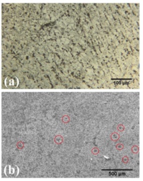 Figure 3a shows the microstructure by optical microscopy of zone 1, the light areas correspond to ferrite and the dark areas to pearlite. In these two first layers, when the material is deposited on the support base it undergoes a process of rapid solidification, which favours a dendritic type growth, which is observed in figure 3b (SEM image). It is important to note that inclusions may occur in the deposited material (first two layers, figure 3b, circles in red), however, this is typical of the manufacturing process and is studied in detail by Cervantes et al. in [2], these defects do not exceed 5% of the material by volume.