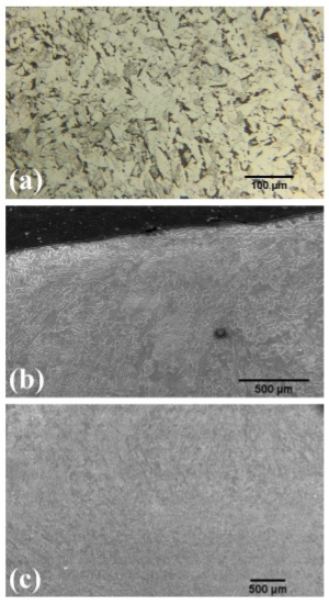 The zone 3, or upper zone of the steel, composed of the last layer is shown in figure 5. Figure 5a shows the right lateral zone of the layer, where the orientation of the grains is observed, this tendency is generated by the high solidification speed in the material, in figure 5b and 5c the left lateral and central zone of the layer is shown, again the formation of a dendritic type structure predominates [34], condition that is linked to the solidification process [33], this high solidification speed is linked to the contact that the material has with the environment, which favors a heat transfer by convection. These results are consistent with those reported in [2].