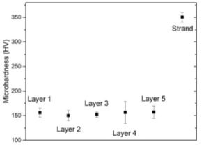 The microhardness results are shown in Figure 6, it is important to remember that each of the layers has an average thickness of the order of 3000 µm. A behavior that tends to be constant is exhibited, however, there is a slight change in the intermediate zone, this is due to the high homogeneity of the phases, which is linked to the different solidification speeds that make up the material, these results are consistent with those reported by Agredo et al. [8], with a deviation of less than 5% of the reported results. A comparison is established between the layers and the strand, evidencing a greater hardness in the latter, this is related to the severe plastic deformation that the material undergoes in its obtaining process. The steel printing process can be compared to a normalized heat treatment, when it is melted, deposited and slowly cooled to room temperature. In the investigation carried out by Franco and Paz [35], they reveal a hardness after normalized heat treatment of around 130 HV for a material with similar carbon content, in the case of the steel produced in this investigation, a hardness of the order of 150 HV.