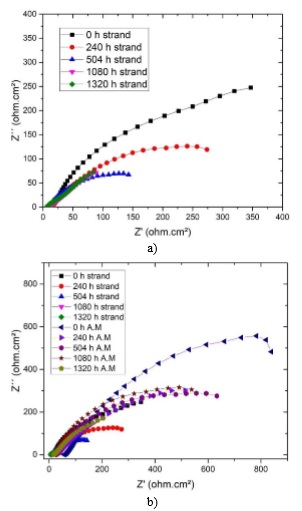 Figure 7a shows the Nyquist diagram by EIS test for the strand, in Figure 7b, the behavior for the additive manufacturing steel and the strand is observed. In general it is evident the formation of a capacitive-resistive circuit for both materials, there is a clear difference of the printed steel, in this last one is observed an arc of greater diameter, this increase is linked with a greater resistance to the corrosion for the material deposited by layers [36- 37]. In both cases the materials show a reduction in the diameter of the arc as the immersion time passes, reflecting a progressive decrease in corrosion resistance