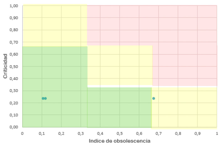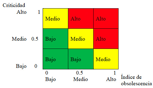 Se propone utilizar una matriz cuadrada de 3x3 para expresar los resultados. En el eje X de la matriz se plantea ubicar los resultados asociados a los índices de obsolescencia (probabilidad), y en el eje Y de la matriz los resultados de criticidad (impacto).