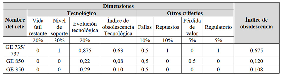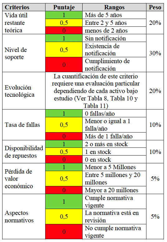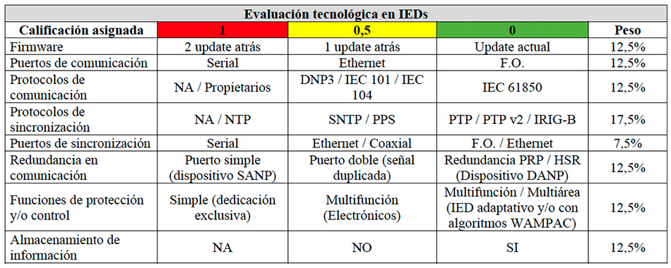 Un criterio que requiere una evaluación más profunda es “evolución tecnológica”, para esto se debe reunir un grupo de expertos en el activo bajo evaluación para establecer variables que identifiquen si la tecnología que usa el equipo es obsoleta, teniendo en cuenta criterios como memoria, capacidad, funciones y las demás que apliquen. Para los IEDs se propuso cuantificar la evolución tecnológica según la Tabla 8, usando el sistema de pesos y puntajes según la característica que posea el relé, se le asignara la calificación de la fila superior y luego se multiplicará por el peso de la última columna, se suman los productos para obtener el valor de la evaluación.