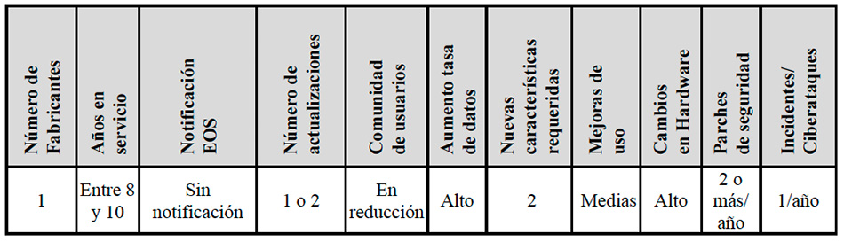 El ciclo de vida incluye todos los aspectos de la gestión de activos desde el concepto inicial hasta la eliminación de este. Un activo alcanza el final de su vida útil cuando ya no cumple con los requisitos, sean técnicos, económicos o estratégicos [12]. Debido al rápido desarrollo de la tecnología, los elementos nuevos brindan ventajas sobre los más antiguos, ya sea por su desempeño, funciones, costo de operación y demás, dando lugar a la obsolescencia tecnológica. Siendo inviable la determinación de un índice de salud para activos digitales, el factor crítico de reemplazo es la obsolescencia tecnológica. Los proveedores de los activos influyen en gran medida en el ciclo de vida, en [7] se considera el ciclo de vida del producto desde el desarrollo de este hasta el fin de soporte por parte del fabricante, que normalmente emite una notificación (EOS:End Of Support) declarando las fechas en las que dejará de dar atención al producto. En el sector eléctrico se tiene una adopción masiva de elementos de TI que plantean retos adicionales desde el punto de vista de gestión de seguridad de la información y seguridad cibernética en general, demandando soporte por parte del fabricante para mantener los activos actualizados y con los parches necesarios. La creciente velocidad de desarrollo de hardware y software es impulsada estrechamente por la necesidad de hacer frente al cibercrimen.