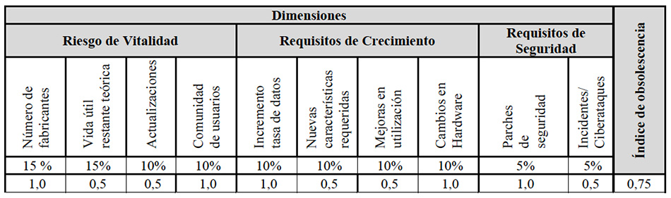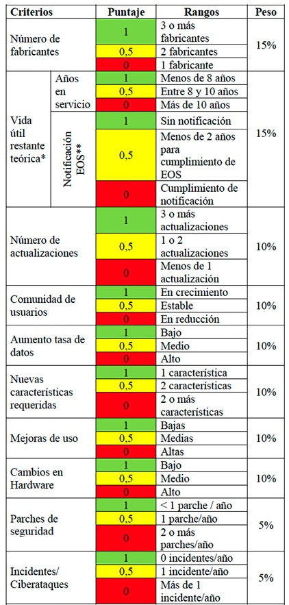 Palabras clave: evaluación de riesgo de obsolescencia, gestión de activos, obsolescencia, vida útil remanente, software, hardware, toma de decisiones, mitigación de riesgo, impacto, priorización.