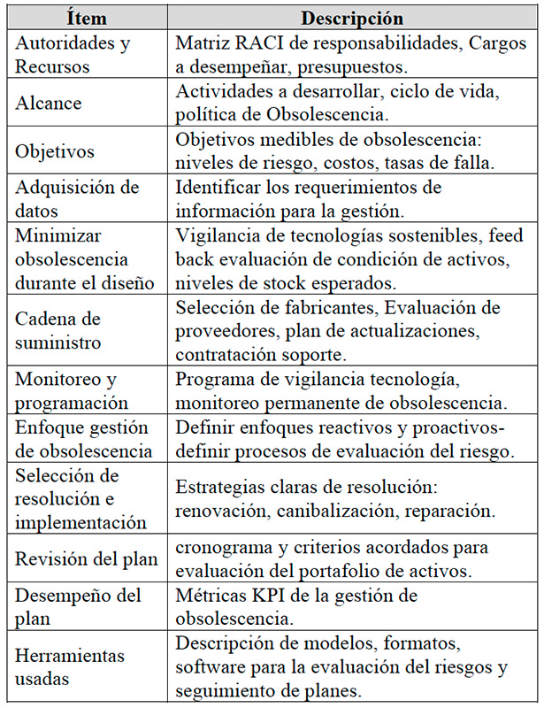 De acuerdo con la cláusula 7 del estándar IEC 62402:2019, el Plan de Gestión de Obsolescencia (OMP por sus siglas en inglés) describe las actividades de prevención, detección/identificación y tratamiento de los efectos de obsolescencia a través de todas las fases del ciclo de vida del activo, para alcanzar un compromiso entre el costo de ciclo de vida para el desempeño del activo y su disponibilidad, sostenibilidad y seguridad. La Tabla 1 resume el contenido mínimo del OMP: