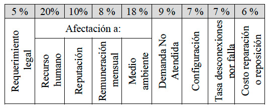 El impacto corresponde a la criticidad que generaría la no disponibilidad de un activo y depende en gran medida del entorno operativo donde se encuentra instalado [16]., se evalúa estableciendo los criterios a considerar de acuerdo con el contexto de la empresa. En el caso del sector eléctrico se proponen las variables de la Tabla 5. Se debe determinar si el riesgo que genera la indisponibilidad o falla del activo es Alto, Medio o Bajo, se le asigna el puntaje según la Tabla 2. El peso asignado a cada variable aparece en la fila superior, los valores son modificables a consideración de expertos.