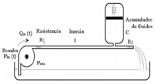 El sistema hidráulico que se muestra en la Figura 3 es impulsado por una bomba de presión constante [11]. En el tiempo 𝑡 = 0 el tanque está vacío y la bomba está encendida a una presión constante de 10. La inercia del fluido acumulado 𝐼 y los elementos de resistencia 𝑅1 se utilizan para tener en cuenta las caídas de presión en la tubería. El tanque se modela como una capacitancia de fluido 𝐶, y la válvula de salida se modela como una resistencia lineal. Se suponen los siguientes valores: