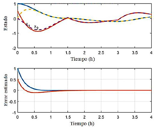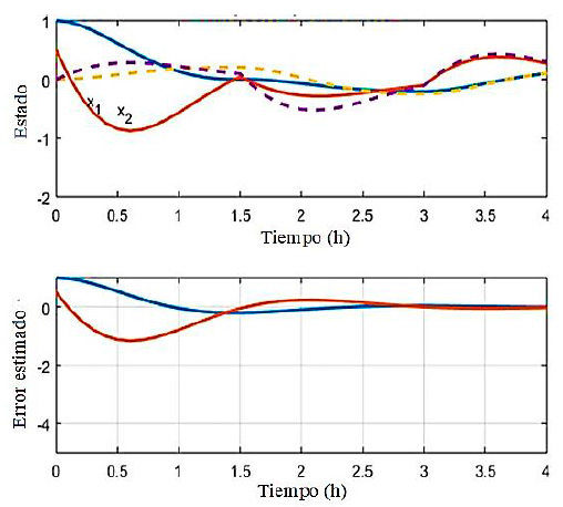 (12)Para el caso en lazo abierto (Figura 4) se observa que para las variables de estado estimadas el error de estimación converge a cero, pero lo hace de una manera muy lenta, lo que explica que no sería una solución óptima [15].