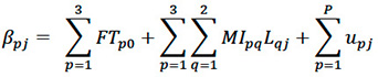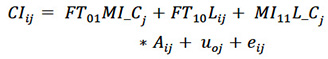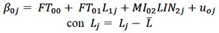 (9)En esta fórmula, indica el cambio en las competencias de innovación CI promedio de los estudiantes por cada unidad de aumento en nivel de desarrollo de pensamiento lógico (L) controlando los efectos de las variables restantes, o la relación existente entre L y las CI, controlando los efectos de las variables restantes. indica el cambio en las competencias investigativas promedios de los estudiantes como consecuencia de las competencias de desarrollo del pensamiento lógico. es la interacción cruzada entre competencias propias de la competencia técnica y las competencias metodológica investigativa. 𝒖𝒐𝒋 es el efecto aleatorio del j-ésima programa que cursa sobre las medias y. 𝒆𝒊𝒋 es el error aleatorio asumido con distribución normal e independiente con media cero y varianzas constantes (,) respectivamente [20].